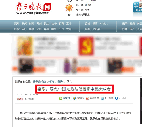 揚子晚報:桑樂要做中國光熱與健康家電集大成者
