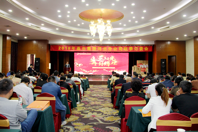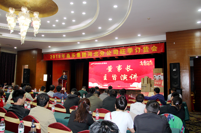 4月26日,桑樂集團河北分公司旺季訂貨會隆重召開,桑樂集團領導層、河北分公司銷售人員、河北省縣、鄉核心經銷商200多人齊聚濟南,共商河北市場新篇章。會議極大程度的提升了河北團隊的激情與士氣,為接下來旺季市場攻勢蓄滿了正能量。